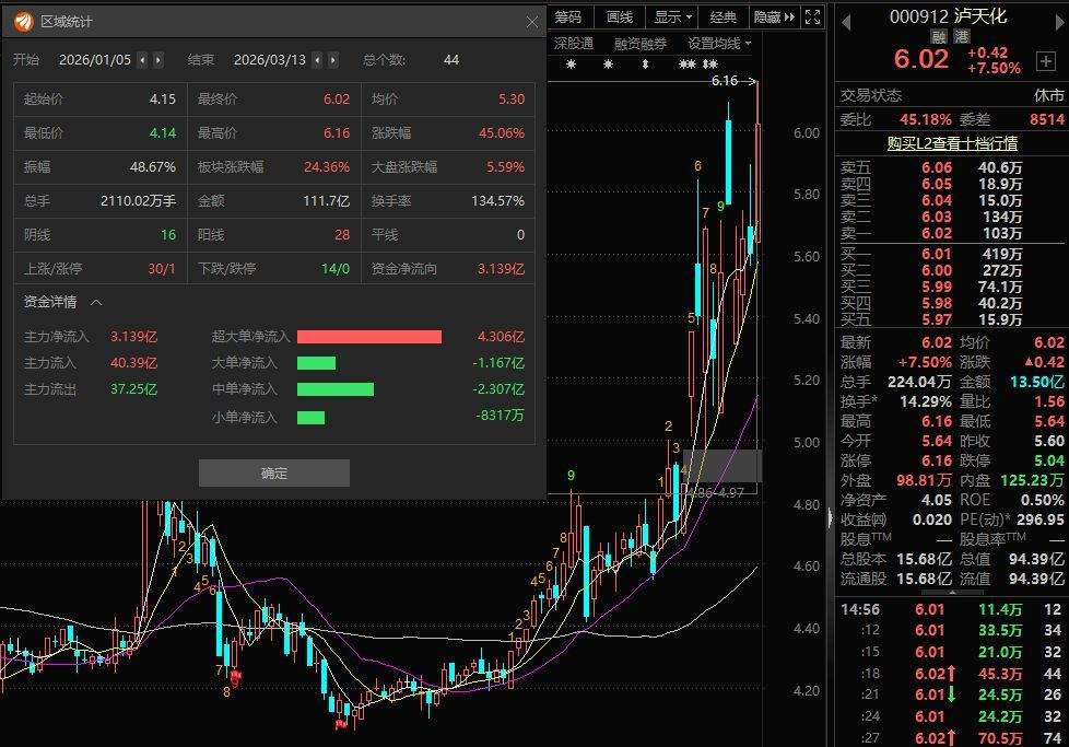 二级市场上,泸天化3月13日收盘再度上涨7.5%,报6.02元,全天成交金额为13.50亿元,放出“天量”,换手率14.29%。