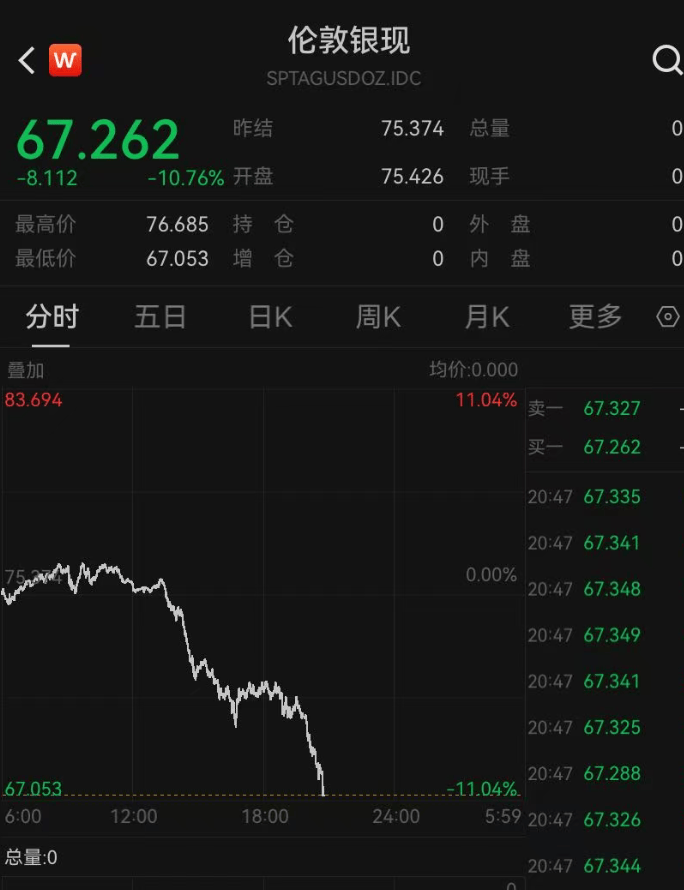 现货白银日内跌超10%,报67美元/盎司。