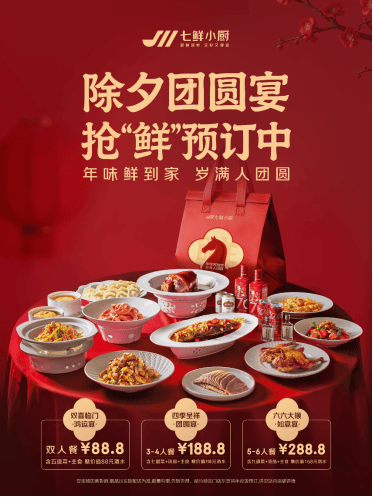 七鲜小厨首次上线年夜饭套餐,不仅是在新春佳节之际为千家万户带来舌尖上的享受,更是将高标准的食品安全标准、高质价比的产品研发与充满文化符号的营销活动深度融合,希望树立起品质餐饮行业发展新标杆。即日起至2月14日,打开京东外卖,搜索“七鲜小厨”,锁定带有“年夜饭”标识的门店,一键预订,开启暖心春节。
