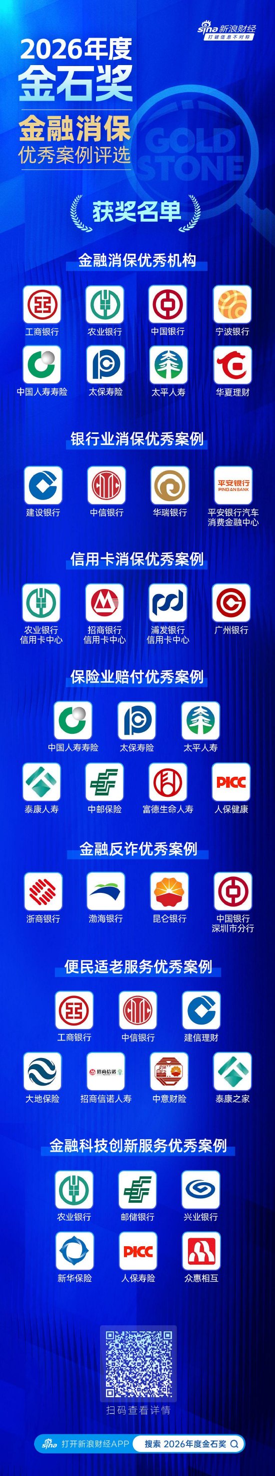 愿保金石志,无令有夺移!在3·15国际消费者权益日来临之际,新浪财经主办的“2026 年度金石奖暨金融消保优秀案例评选”结果正式揭晓。本次活动聚焦金融消费者权益保护,经案例征集、专家评审,从上百个案例中评选出金融消保优秀机构及六大行业优秀案例。