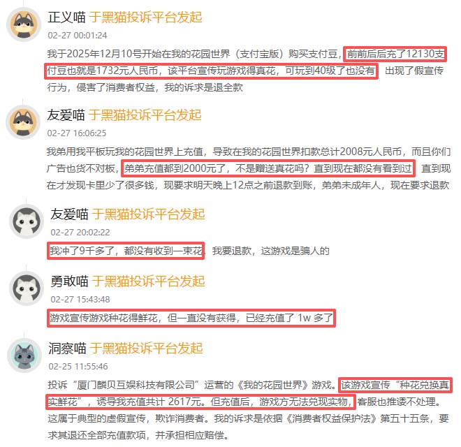 本月,有不少玩家反映《我的花园世界》以 “玩游戏得真花” 为噱头诱导充值,有的玩家充值数百至数千元不等,更有玩家充值过万,却始终未收到承诺的鲜花,广告宣传与实际严重不符。截至目前,该款游戏累计收到投诉近700件,商家未进行有效处理。