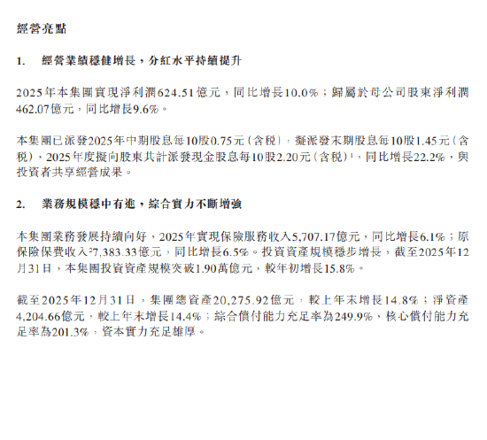 3月26日金融一线消息,中国人保发布截至2025年12月31日止年度业绩,该集团期内取得营业总收入6692.54亿元(人民币,下同),同比增加7.56%;归属于母公司股东净利润462.07亿元,同比增加9.62%;每股基本收益1.04元;拟派发末期股息每10股1.45元。
