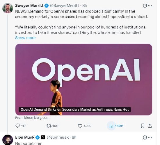即便如此,投资者的热情丝毫未减。OpenAI或许刚刚完成了创纪录的1220亿美元融资,但在二级市场上,Anthropic的强劲势头不容忽视,竞价反映出两者的估值差距正在不断缩小。