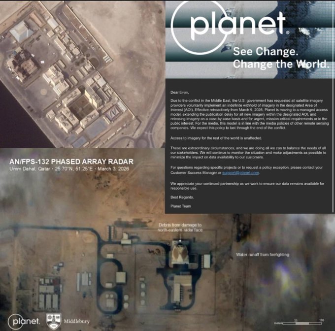 美国政府已要求所有卫星影像服务商自愿无限期暂停指定区域(感兴趣区域AOI)内的影像发布,此前伊朗发动的打击暴露了美军基地受损情况。