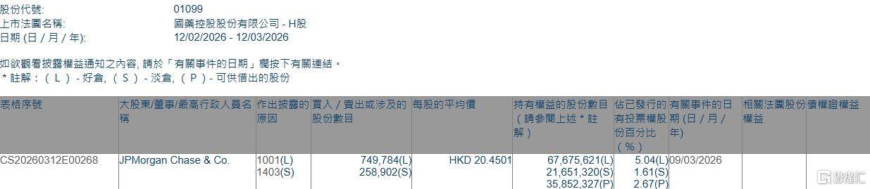 格隆汇3月12日丨根据联交所最新权益披露资料显示,2026年3月9日,国药控股(01099.HK)获JPMorgan Chase & Co.以每股均价20.4501港元增持好仓74.98万股,涉资约1533.32万港元。