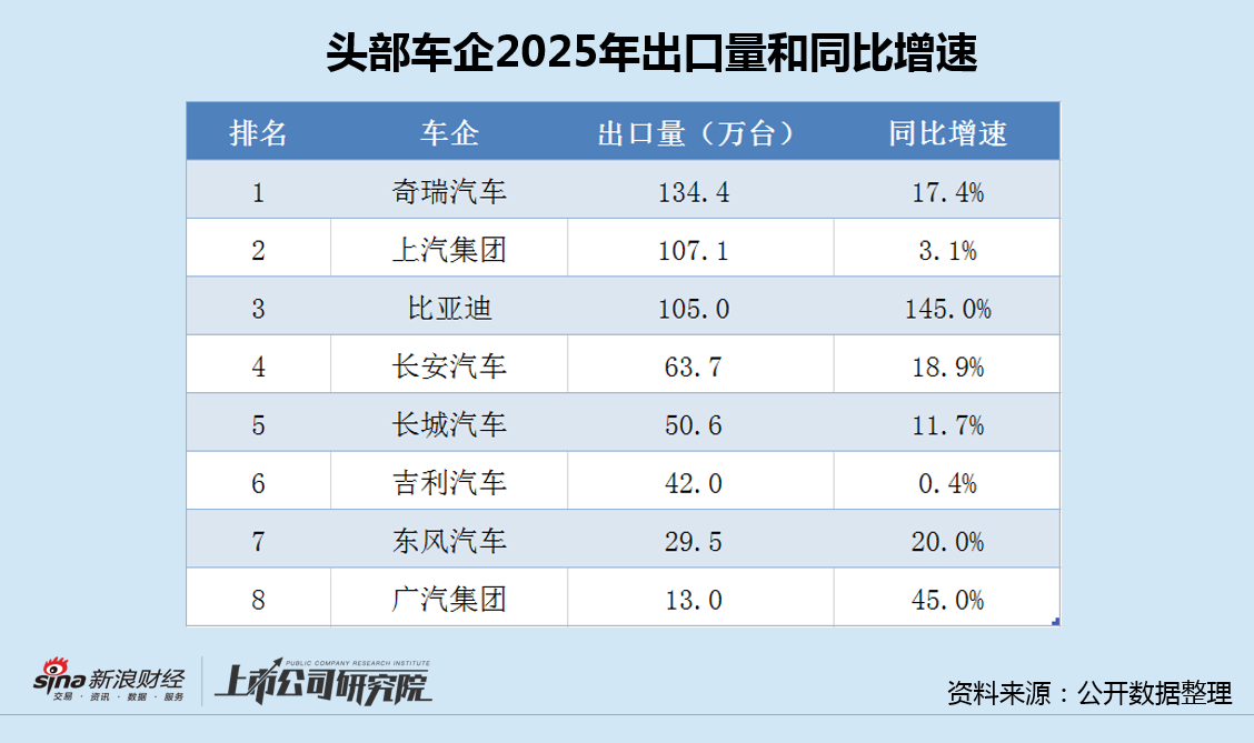 头部车企中,奇瑞汽车、上汽集团和比亚迪出口均超百万辆,位列前三,而吉利汽车全年出口42万辆,同比仅增长0.4%,增速垫底,出现明显掉队。
