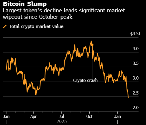 此次下跌标志着比特币自去年大部分时间里的迅猛上涨中骤然回落,当时特朗普亲加密货币的立场曾推动该代币在去年急剧飙升。但本月市场开始出现裂痕,地缘政治紧张局势升级引发了全球金融市场的震荡并抑制风险偏好。这触发了比特币从1月中旬开始的骤跌,引起连环跌势,因为基金被迫卖出资产以应对赎回及杠杆头寸的强行平仓。