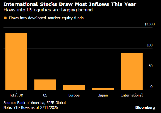 资金流动印证了Hartnett的观点。美国银行援引EPFR Global的数据,今年以来,欧洲、日本和其他国际发达市场的股票基金共吸引资金1040亿美元,远超流入美国基金的250亿美元。