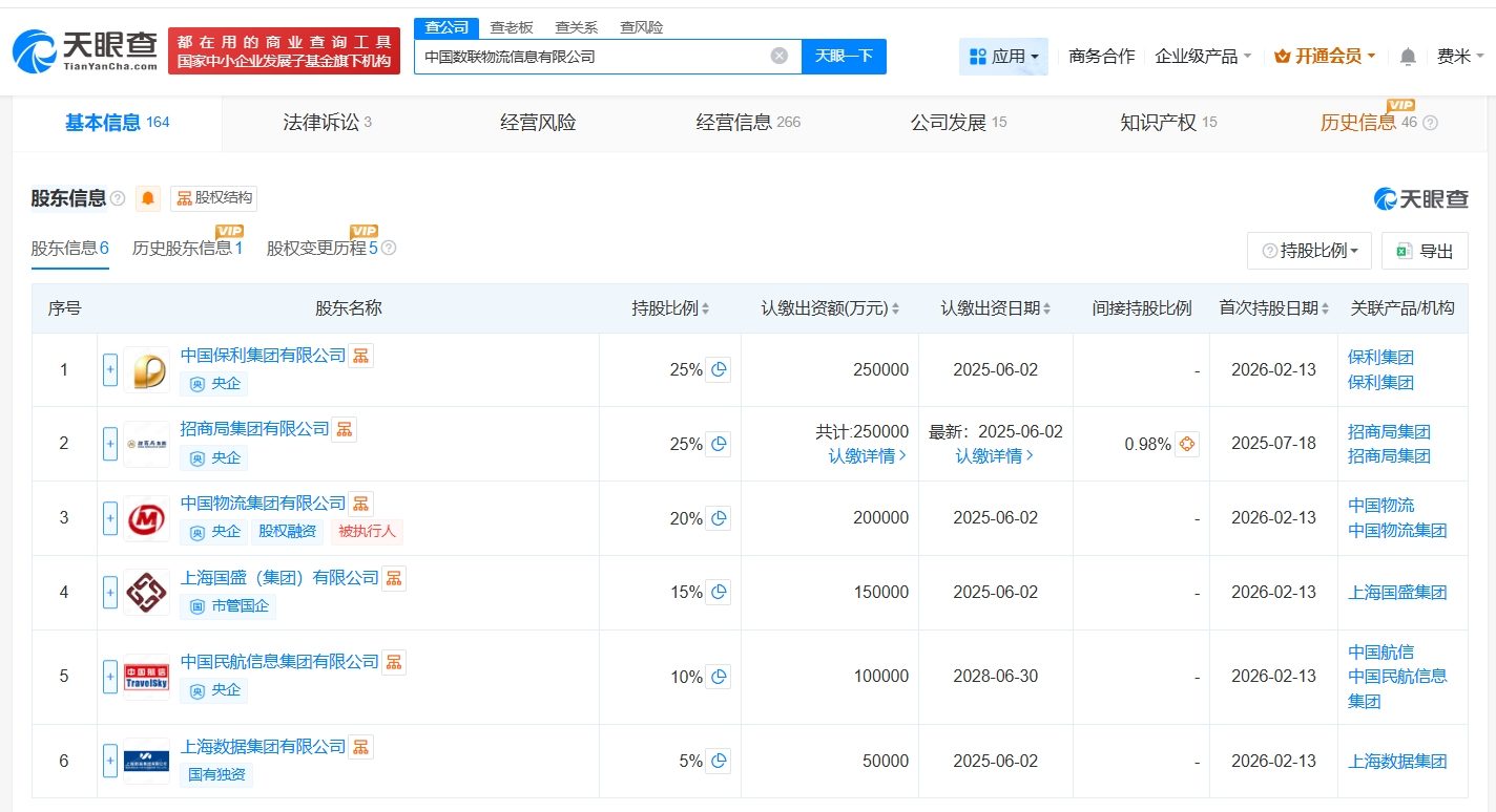 天眼查App显示,近日,中国数联物流信息有限公司发生工商变更,新增中国保利集团有限公司、中国物流集团有限公司等为股东,同时注册资本由4500万人民币增至100亿人民币,增幅约22122%。