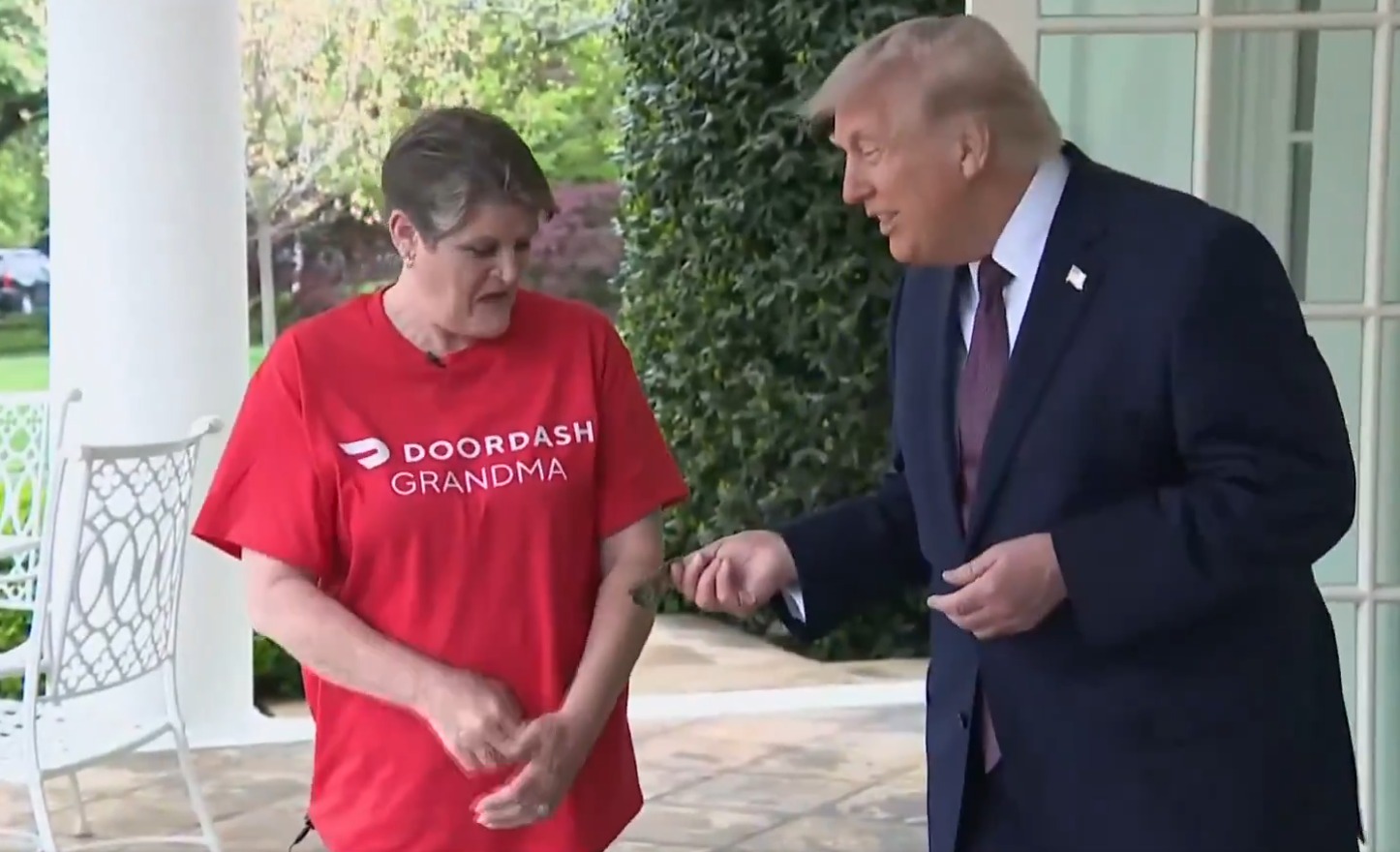 来自阿肯色州的莎伦·西蒙斯身穿一件红色的“DoorDashGrandma”T恤衫,在媒体的注视下,拎着两袋快餐敲门。特朗普应门,并在西蒙斯的陪同下,回答了记者们关于各种话题的提问。西蒙斯表示,1月份取消小费税后,她省下了一大笔钱。
