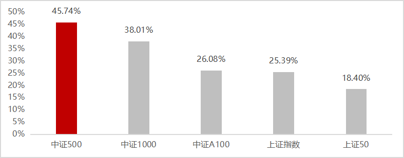 得益于市场整体性上行,过去一年主流宽基指数均取得上涨,其中,中证500指数的表现堪称“亮眼”,在部分主流宽基指数中明显领跑。从数据上来看,中证500指数近一年涨幅达46%,不仅跑赢了上证50、中证A100指数为代表的大盘风格指数,相较小盘风格同样实现了一定超额。(数据来源:Wind,截至26/2/5。指数历史涨跌情况不代表未来表现,不构成对基金业绩表现的保证,请投资者关注指数波动风险)